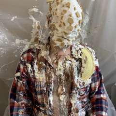 Cloakedmessyfan was surprised by MessyGirlPeyton with a big sloppy cream pie to the face